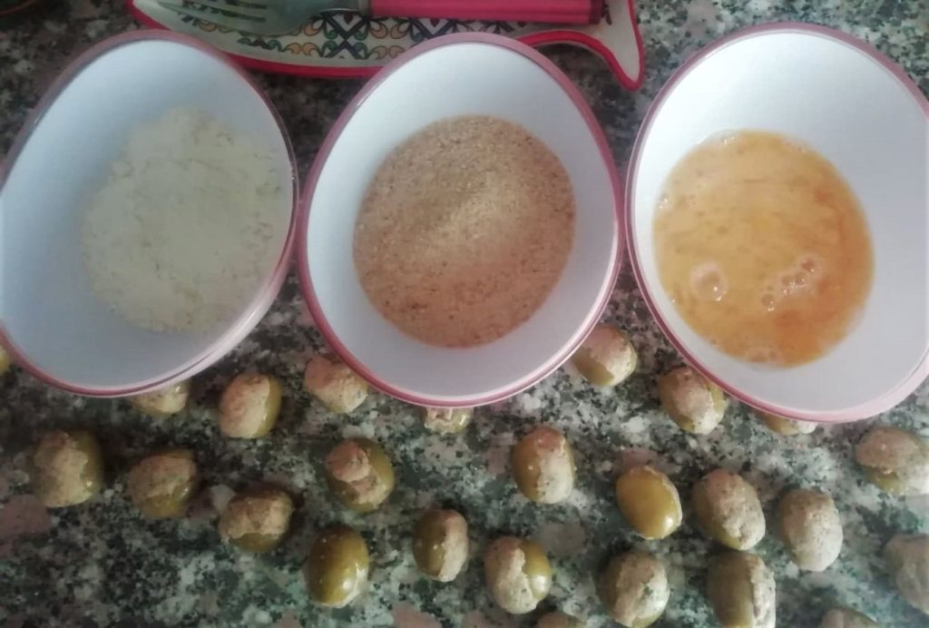 Bereid drie kommetjes voor waarin je de bloem, de losgeklopte eieren met het overgebleven eiwit, en het paneermeel doet. Deze zijn nodig voor het paneren van de olijven.