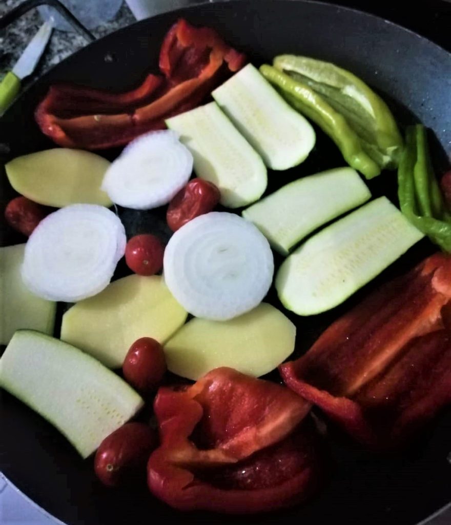 1 paprika, 1 courgette, 2 friggitelli, 1 aardappel,