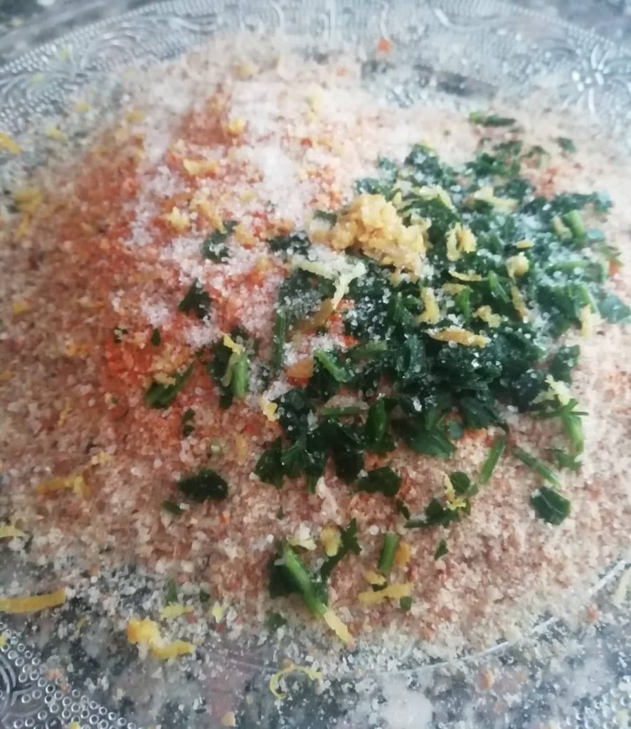 Plaats op een bord het paneermeel, de gehakte peterselie, de geraspte citroenschil, zout, peper en een paar snufjes kurkuma, om de panering kleur te geven en meng daarna de ingrediënten goed.