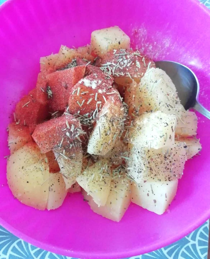 Doe de aardappelstukjes in een kom en kruid ze met de olijfolie, paprikapoeder, knoflookpoeder, rozemarijn, zout en gemalen peper. Meng ze goed met de kruiden van de dressing.