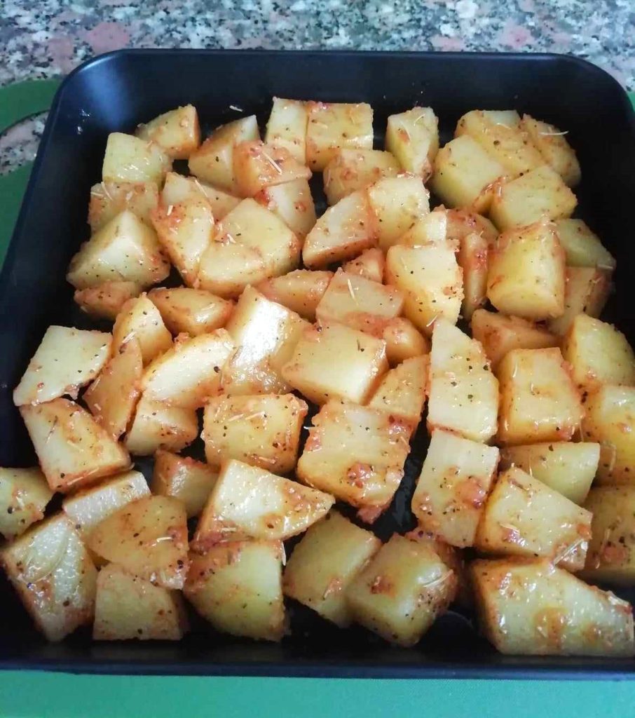 Giet de gekruide aardappelen in de bak van je heteluchtfriteuse, ik gebruikte die lage vierkante van 20×20 cm. en leg ze allemaal in één enkele gelijkmatige laag.