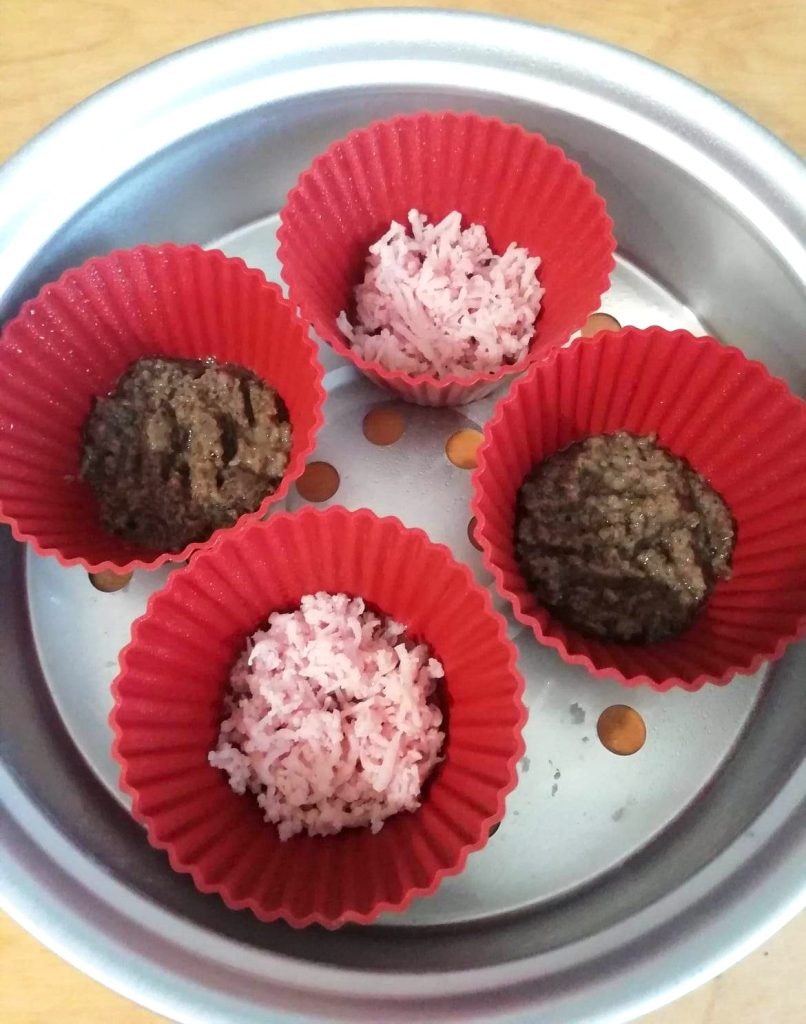 Voor het stomen van de eieren heb je een stoompan nodig, in mijn geval gebruikte ik eenelektrische waar ik de witte rijst in klaar maak, van Oster, maar die met bamboemandjes werkt ook prima. De siliconen bakvormpjes voor eenpersoonsporties zijn onmisbaar omdat ze het uitnemen van de eieren vergemakkelijken. Let erop dat je niet te veel vloeibare of halfvloeibare extra ingrediënten toevoegt, anders wordt de vorm niet homogeen. Beslis ook of je ze bovenop de eieren legt of eronder; bovenop (zoals je op de foto ziet) krijg je een niet geheel homogeen resultaat, terwijl eronder de vorm van het ei netjes zichtbaar blijft.