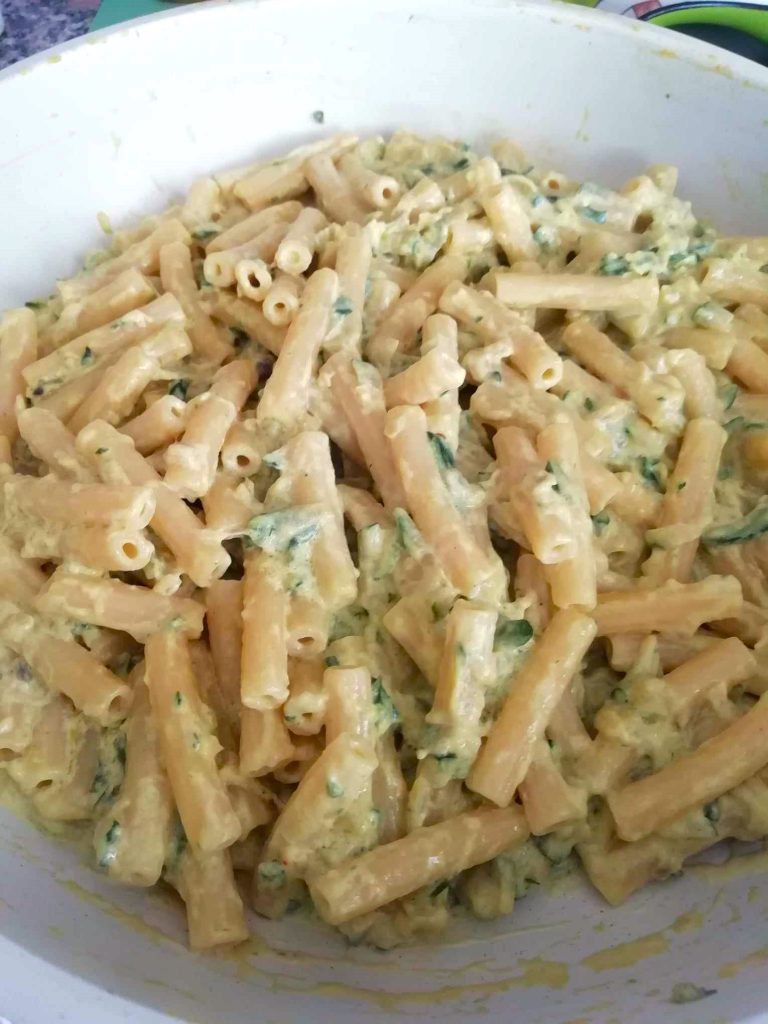 Sedanini is mijn favoriete pastavorm voor deze super romige saus, en ik gebruik een soort pasta gemaakt van gemengde glutenvrije meelsoorten, erg lekker. De room is plantaardig, maar voor degenen die niet veganistisch zijn of lactose-intolerant, kan men de traditionele gebruiken en ook een beetje geraspte Parmezaanse kaas toevoegen.