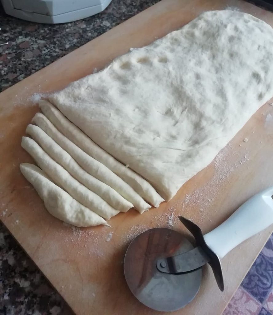 Neem een strook deeg per keer, rek het uit met uw handen en leg het op de bakplaat.