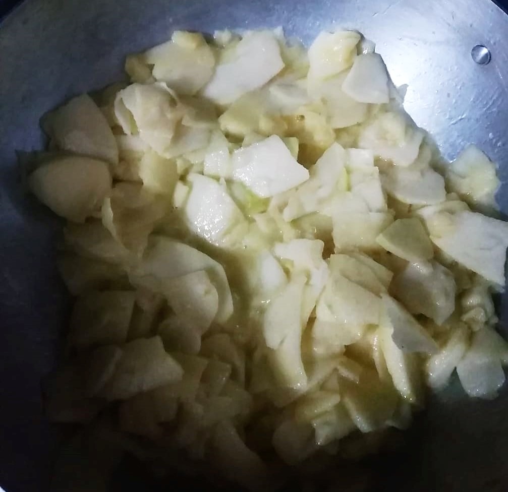 • Schil de appels, verwijder het klokhuis en snijd ze in dunne plakjes. Doe hetzelfde met de uien. Doe de appels en uien in een pan met een scheutje olie en voeg zout en peper toe. Bak ze 10 minuten tot ze zacht zijn, zet het vuur uit, schep ze in een kom en laat afkoelen.