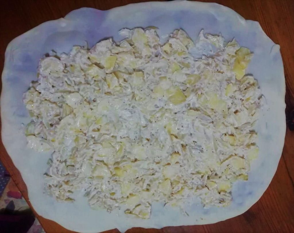 Verdeel het mengsel over het deeg. Begin in het midden en spreid het over het deeg zonder de randen aan te raken. Laat ongeveer 2 centimeter deeg vrij rond de randen en bestrijk deze met een dun laagje olie.