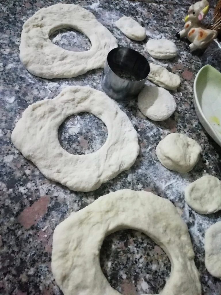 Voeg de gezeefde bloem toe en meng het geheel. Voeg als laatste het zout toe; kneed het deeg, vorm er een bol van en laat het rijzen in de kom afgedekt met een deksel. Wanneer het deeg ongeveer verdubbeld is in volume, na circa 1 uur, is het klaar.Smeer je handen in met olie en zet het deeg op een met bloem bestoven werkblad. Verdeel het in 7–8 gelijke stukken. Vorm een bolletje en druk het plat; maak vervolgens met een ronde uitsteker een gat in het midden van de schijf om de donutvorm te krijgen.