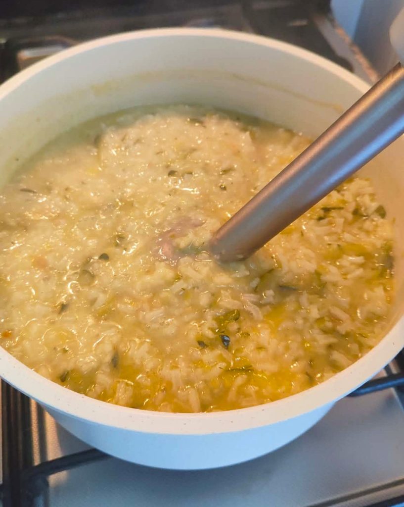 Laat 35–40 minuten zachtjes sudderen, roer regelmatig om te voorkomen dat de rijst aanbrandt.