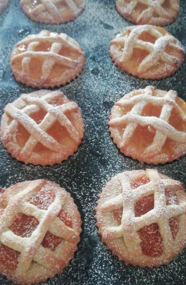 Maak voor elke korstende 4 kleine linten van zanddeeg die je kruisend over de jam legt.