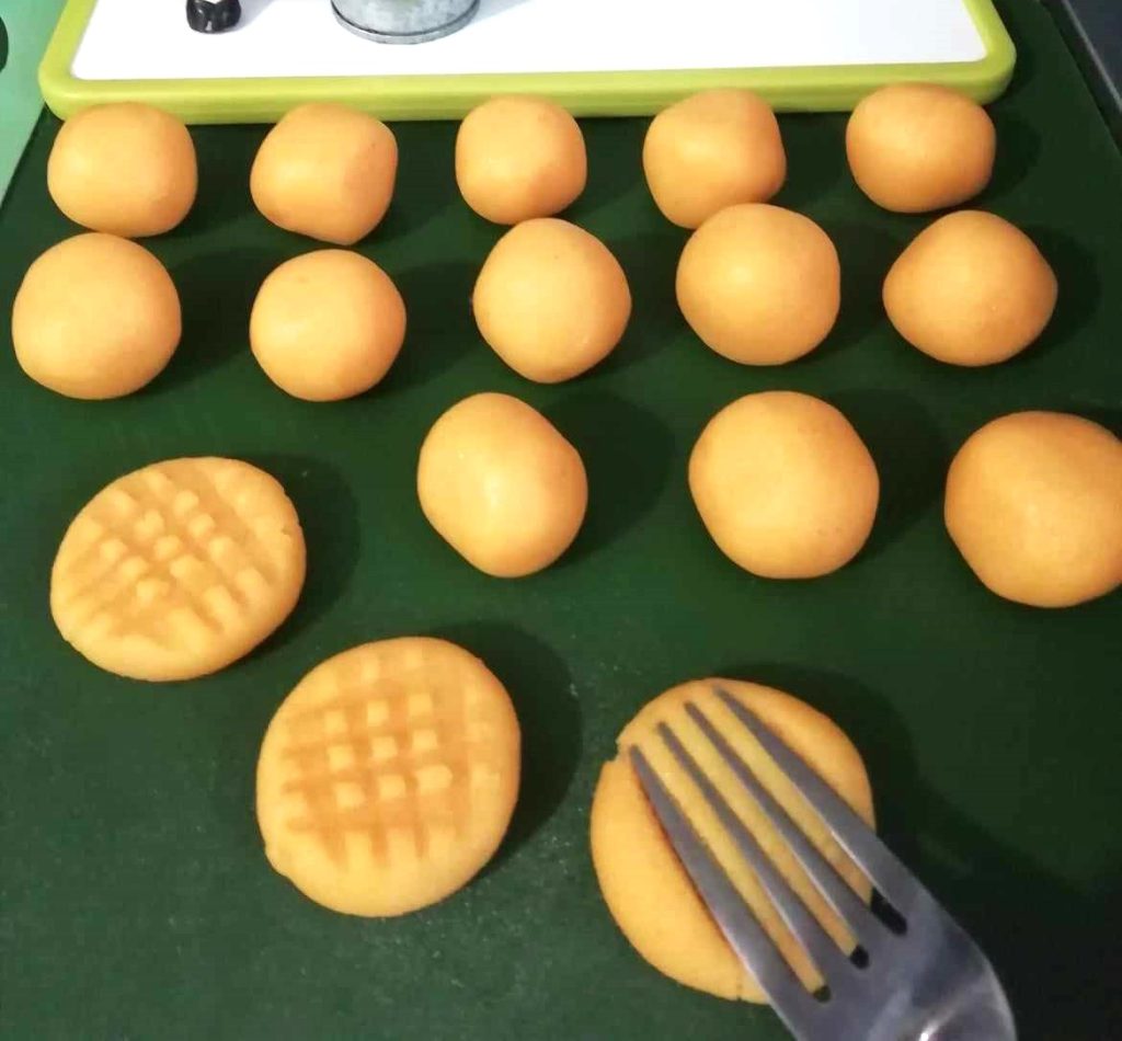 Druk de balletjes met een vork een keer plat en druk ze daarna een tweede keer in kruisvorm met de afdruk van de vork.