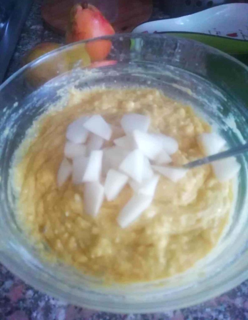 Schil en maak de peren schoon, snijd ze in kleine stukjes en voeg ze toe aan het beslag, goed mengen.