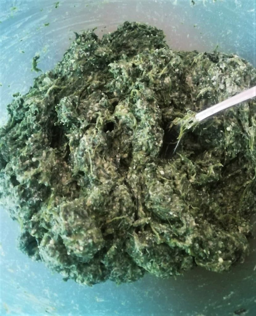 • Zet het vuur uit en laat de spinazie afkoelen, verplaats ze vervolgens naar een grote kom en hak ze grof met een vork. Ik raad aan geen blender te gebruiken.
