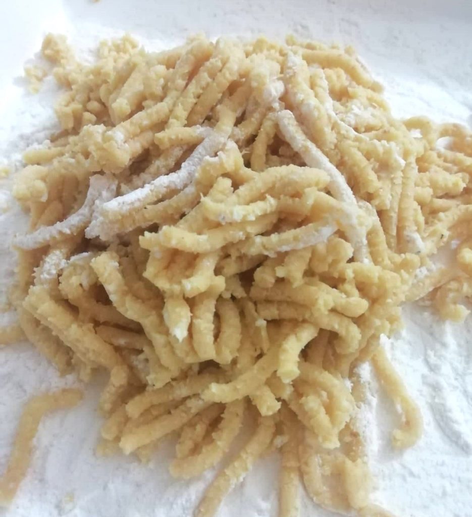 Na het rusten, pers het deeg met het specifieke ijzer voor de passatelli, of met een aardappelpers, en snijd de passatelli op een lengte van 4 tot 8 cm afhankelijk van je voorkeur.