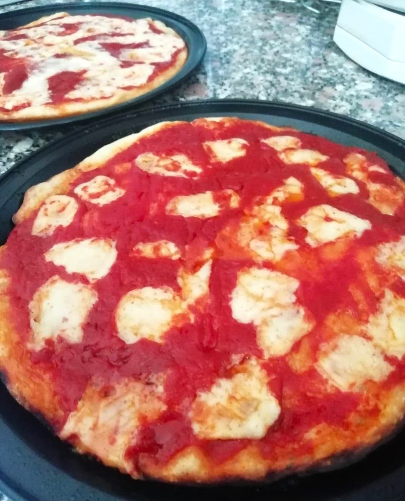 Deze pizza margherita op het bord is voor een ronde bakplaat met een diameter van 26 cm. of voor twee kleine ronde bakplaten met een diameter van 22 cm. Verdubbel de hoeveelheden voor 2 personen, of verdrievoudig ze voor 4 personen, en heb plezier met het toevoegen van andere ingrediënten bovenop de mozzarella, als je dat liever hebt.