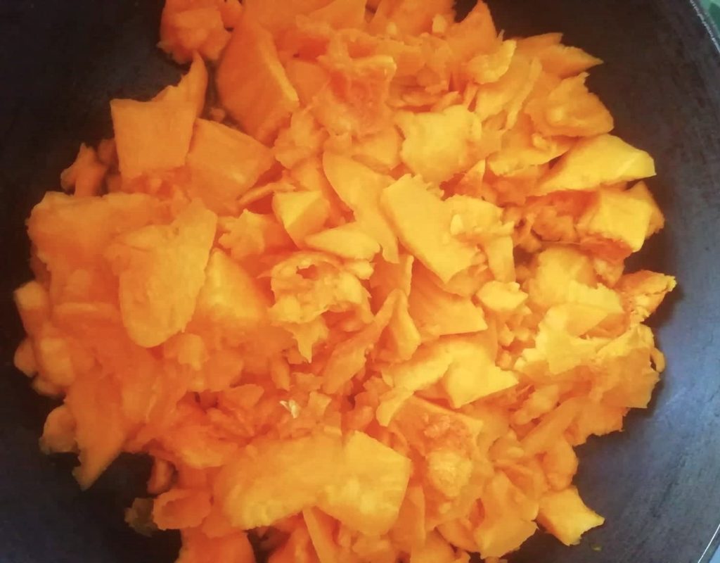 • Snijd 500 gram pulp uit de pompoen, snijd het in kleine stukjes en zet het in een pan met het water.