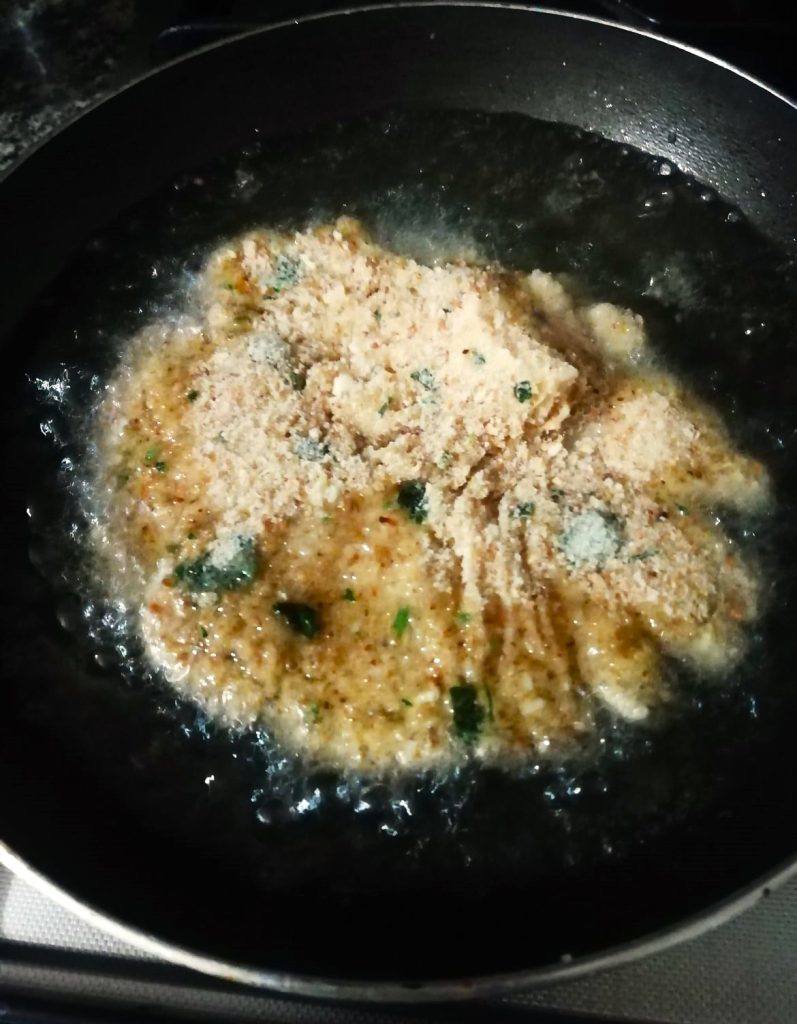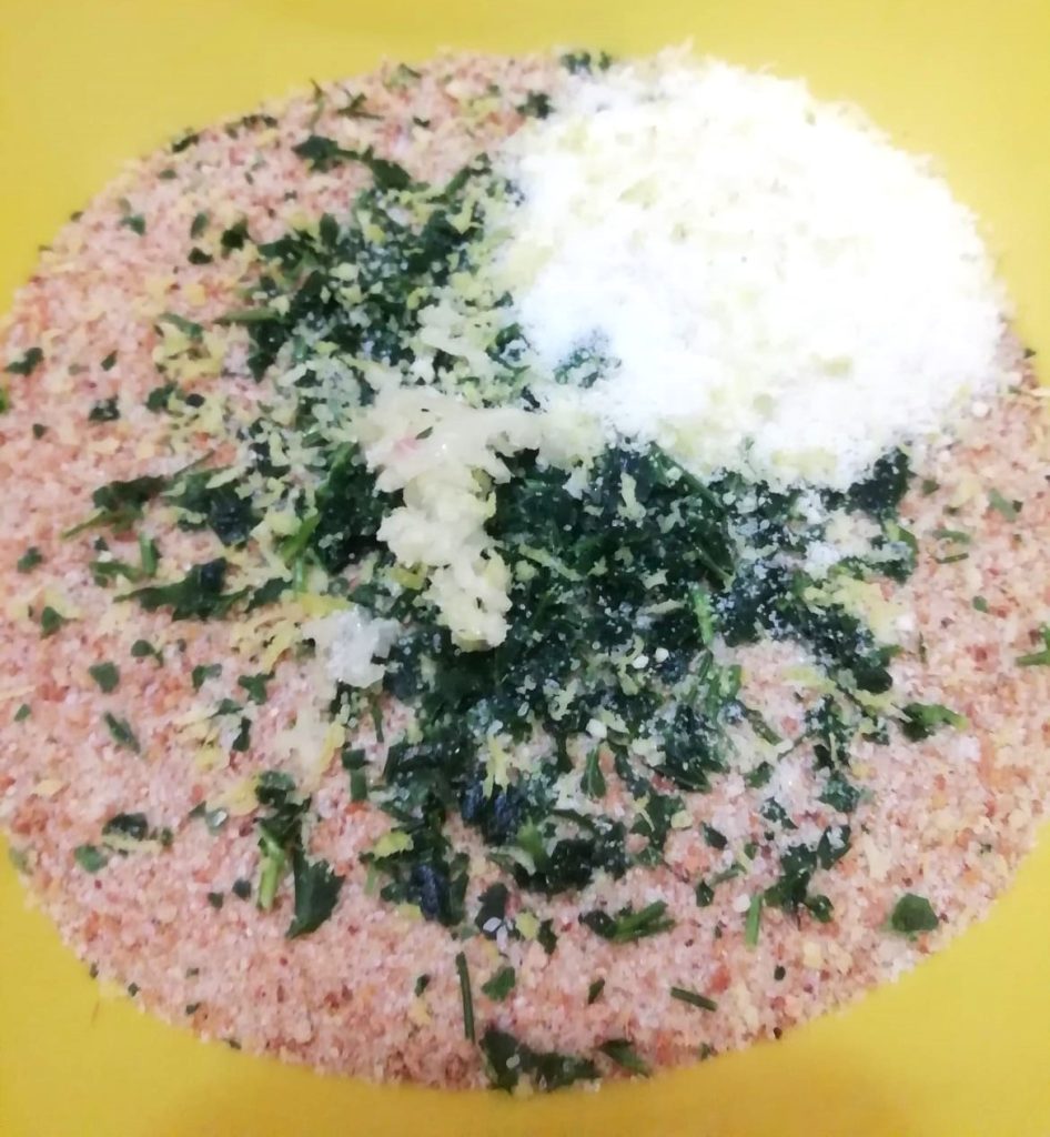 Giet in een andere kom het paneermeel, voeg de geraspte Parmezaan toe, een handvol verse gehakte peterselie, een teentje knoflook geplet met het bijbehorende gereedschap, een rasp citroenschil en 2 snufjes zout.