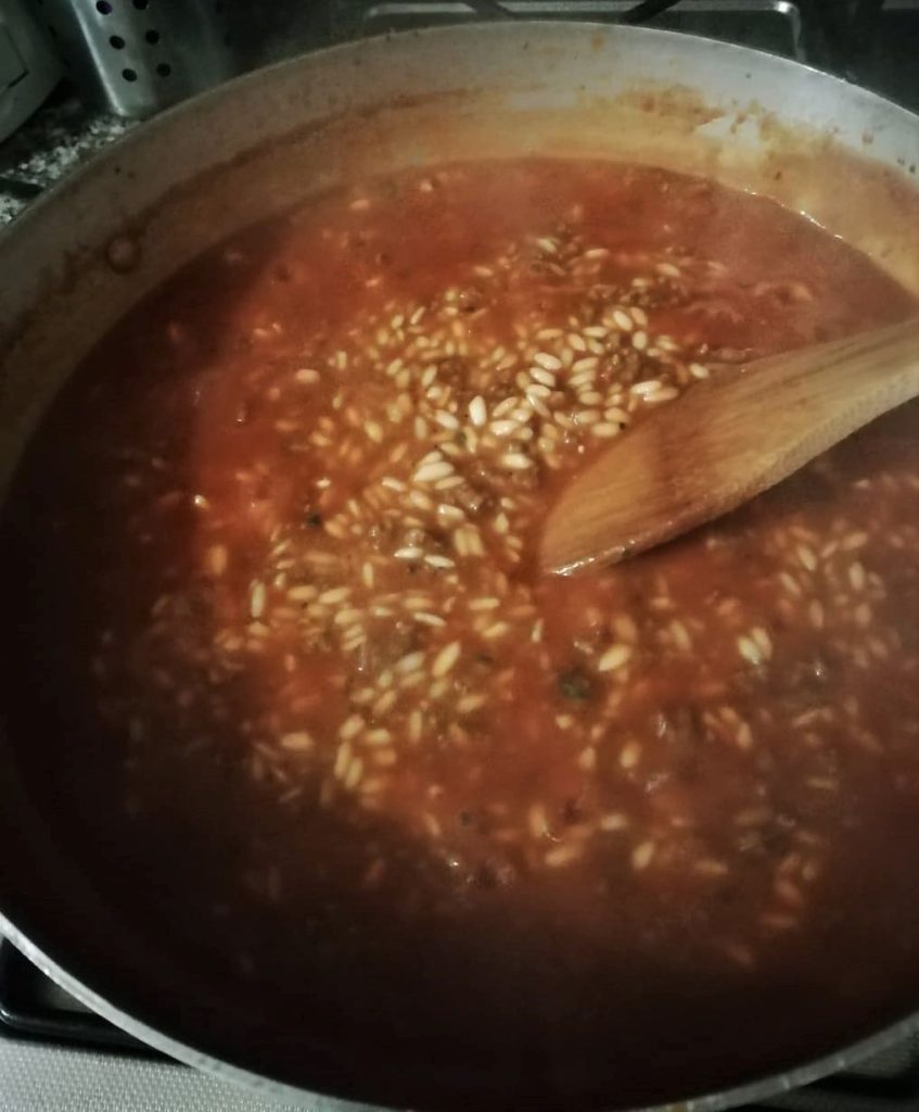 Voeg de vers gehakte basilicum toe aan de saus en laat de ragù een paar minuten koken, net genoeg tijd om de smaak te laten intrekken. Bereid intussen de bouillon van vlees of groenten, ook al is het gemaakt van een bouillonblokje. Nadat de saus een paar minuten heeft gekookt, roer je de rijst erdoor en kook deze beetgaar, waarbij je af en toe een pollepel bouillon toevoegt om te voorkomen dat het aan de pan blijft plakken.