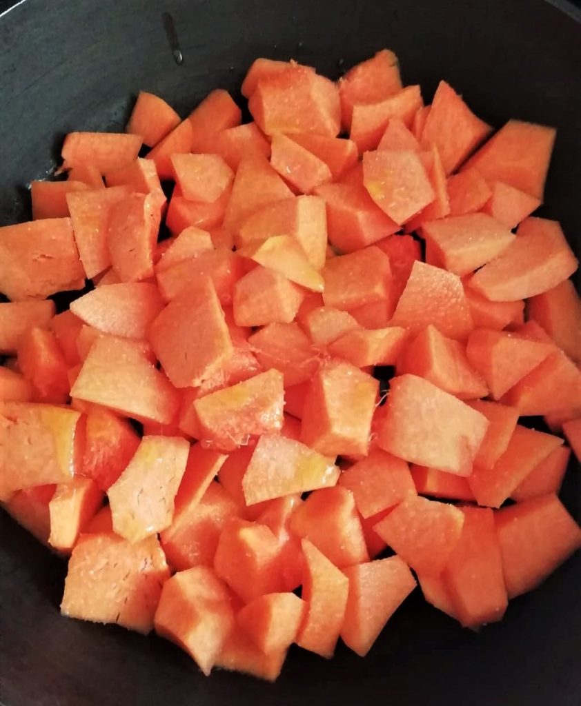 Schoon de pompoen en snijd deze in kleine stukjes. Laat deze sudderen in een pan met 3 eetlepels olijfolie en een snufje zout. Roer af en toe en laat 20 minuten koken.
