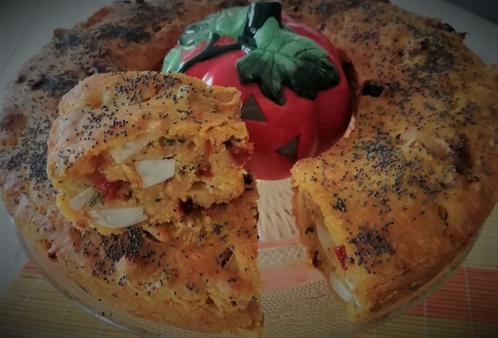 De heerlijkheid van deze vegan rustieke krans met pompoen en tofu is meteen te proeven uit de ingrediënten, gemaakt met pompoencrème, tofu, gedroogde tomaten, verschillende aromatische kruiden en een vleugje maanzaad.