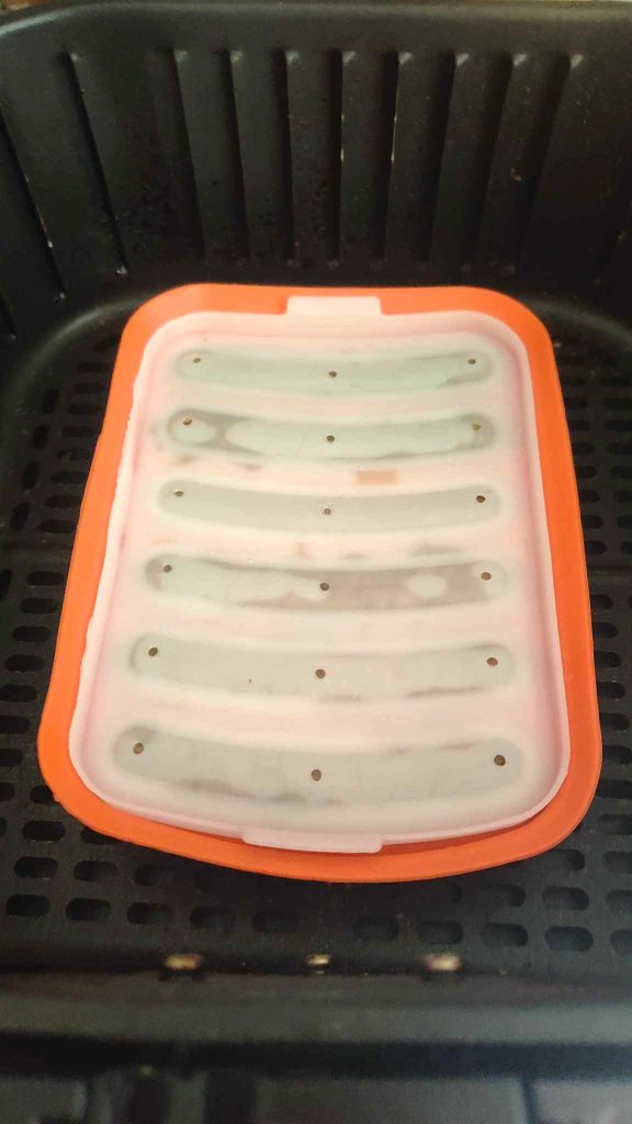 Sluit de siliconen vorm af met het deksel (ook van siliconen) en plaats het in het mandje van de airfryer. Kook op 200° voor 12 minuten, nadat je de airfryer hebt voorverwarmd.