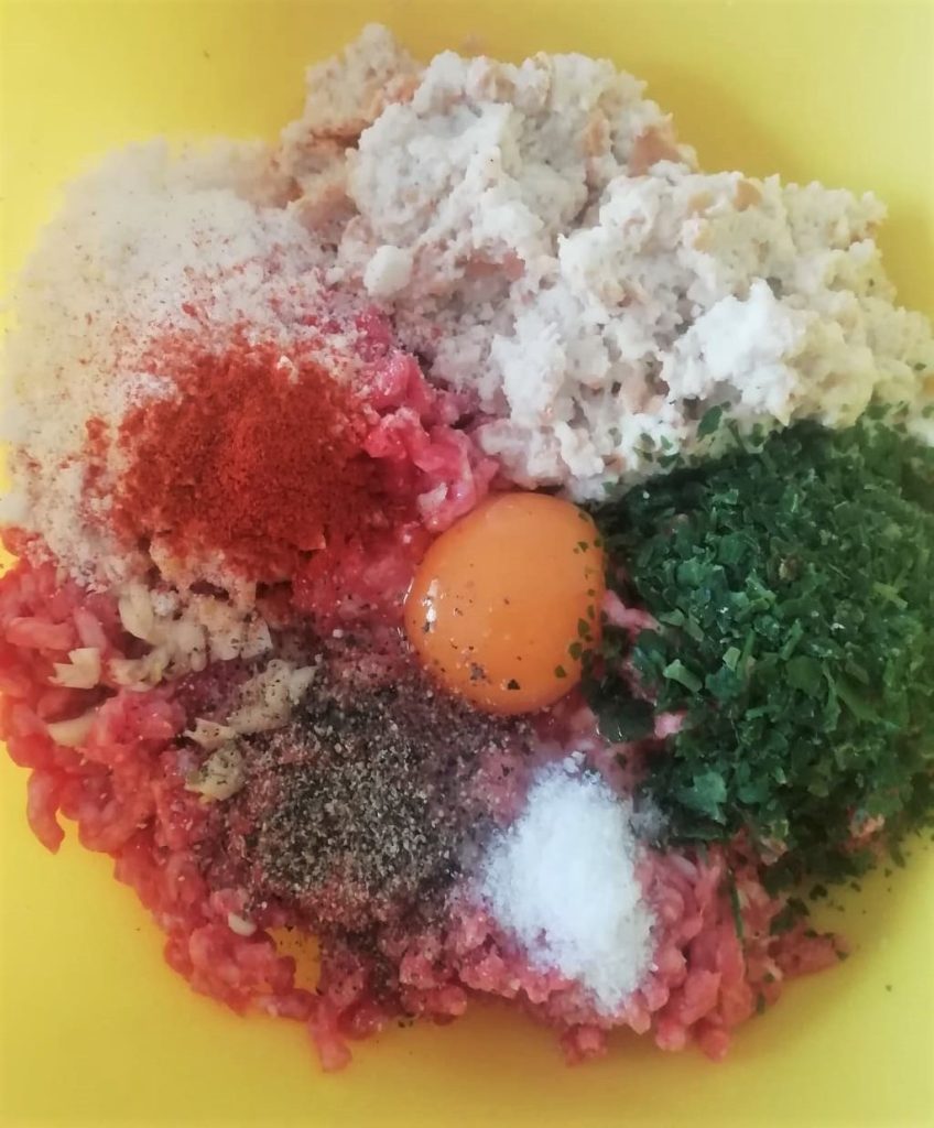 Doe het gehakt in een kom, voeg het uitgeknepen brood, de gehakte knoflook en peterselie en alle andere ingrediënten toe. Voeg ook een beetje olijfolie toe en breng op smaak met fijn zout tot de gewenste smaak is bereikt.