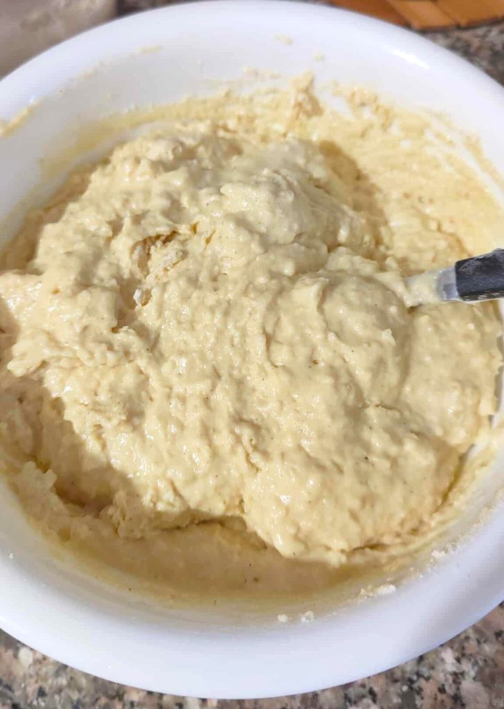 1 – Begin in een grote kom met de vloeibare ingrediënten: de geklopte eieren, de yoghurt, de melk, de olie, het zout, de peper en ook de geraspte Parmezaanse kaas zodat deze beter smelt. Meng het mengsel goed.