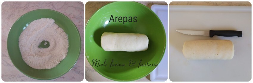 1) Giet de witte maïsmeel in een kom, voeg het fijne zout toe en giet het water in drie keer, terwijl je altijd met de handen roert. Op deze manier kan het witte maïsmeel het water geleidelijk en beter opnemen. Druk de ingrediënten samen tot een bal of een cilinder (zoals op de foto). Het deeg is klaar wanneer het niet meer aan de handen plakt en de kom schoon blijft (het duurt minder dan twee minuten).