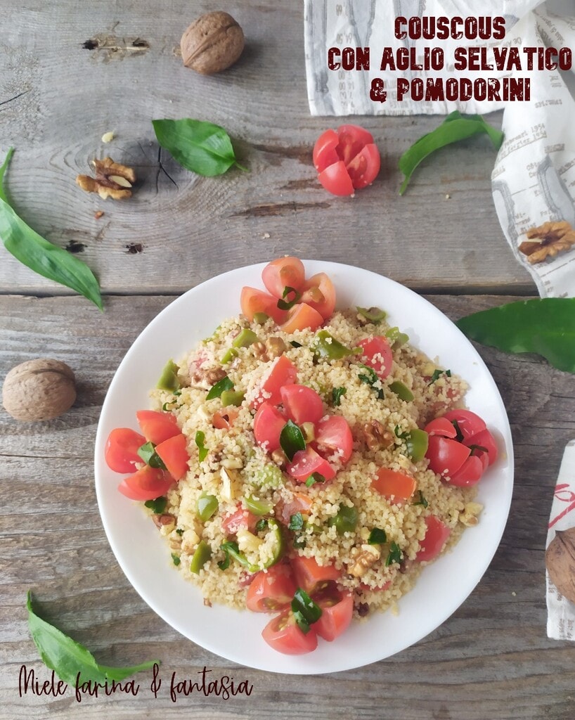 De couscous met daslook en cherrytomaatjes is een smakelijk en zeer eenvoudig koud vegetarisch hoofdgerecht, kleurrijk en zeer aromatisch. Het kan ruim van tevoren worden bereid en we kunnen het ook meenemen naar ons werk of in onze vrije tijd. Dit heerlijke en verfijnde recept kan keer op keer worden gepersonaliseerd door gerookte of ingelegde zalm, tonijn, makreel, hardgekookte eieren toe te voegen; of cottage cheese, kaasschilfers, noten en ga zo maar door.