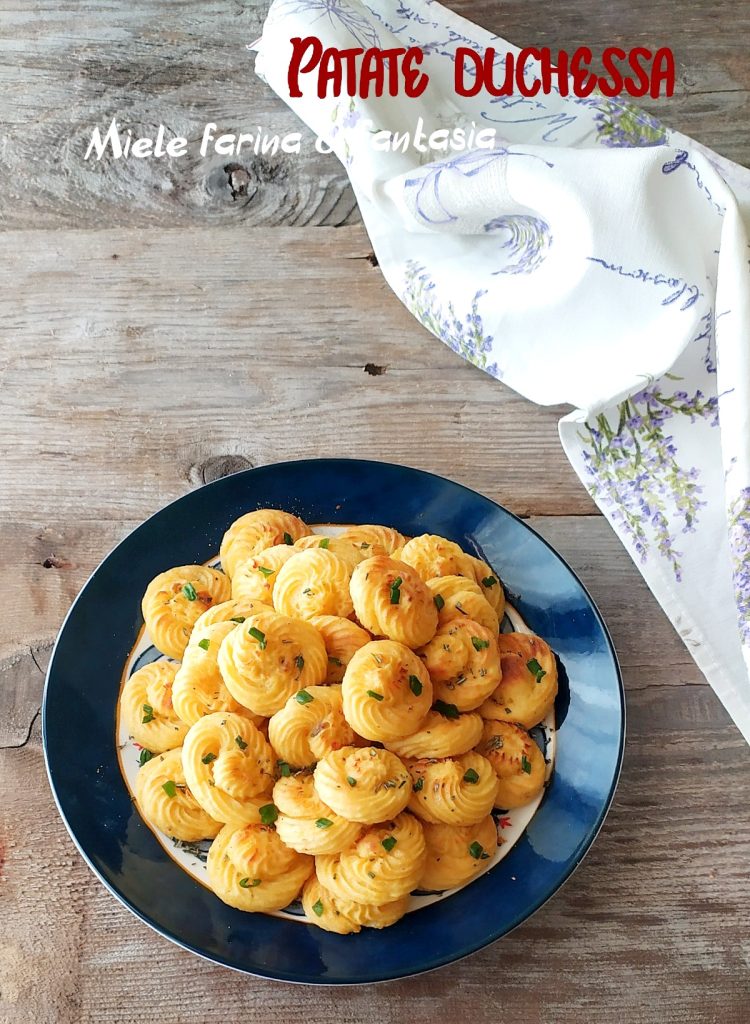 Duchesse-aardappelen zijn heerlijk, chic en heel gemakkelijk te maken; ze passen op buffetten, als voorgerecht of als smakelijk bijgerecht bij vlees- en visgerechten. Je kunt ze naar smaak personaliseren met de kruiden die je het lekkerst vindt en ze kun je ruim van tevoren maken, omdat ze koud geserveerd worden. Het is een recept zonder gluten en het is ook een goede manier om overgebleven gekookte aardappelen te verwerken.