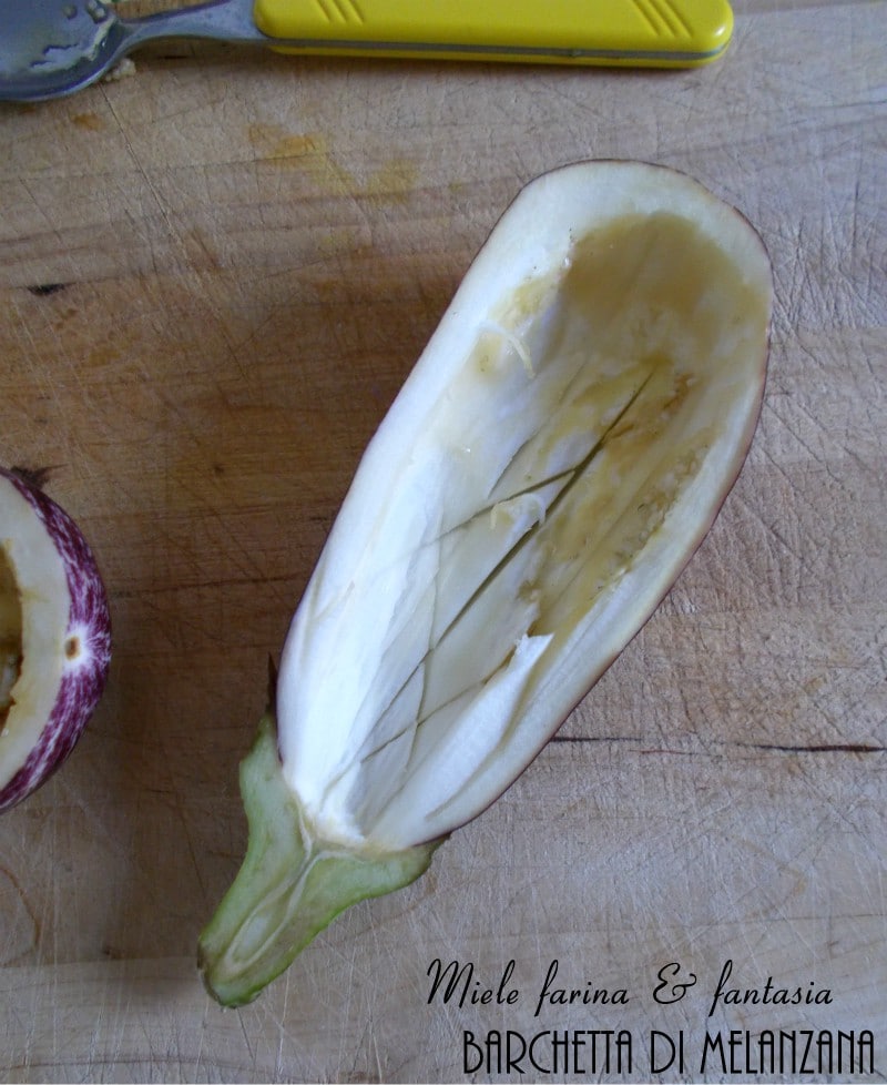 Snijd voorzichtig met een mes het binnenste deel van onze “containers”, smeer ze in met een beetje extra vergine olijfolie, een beetje geraspte kaas en vul ze met de salade van kerstomaten die we eerder hadden bereid, inclusief het vegetatiewater dat onze gevulde fantasie auberginebootjes extra smaak zal geven.
