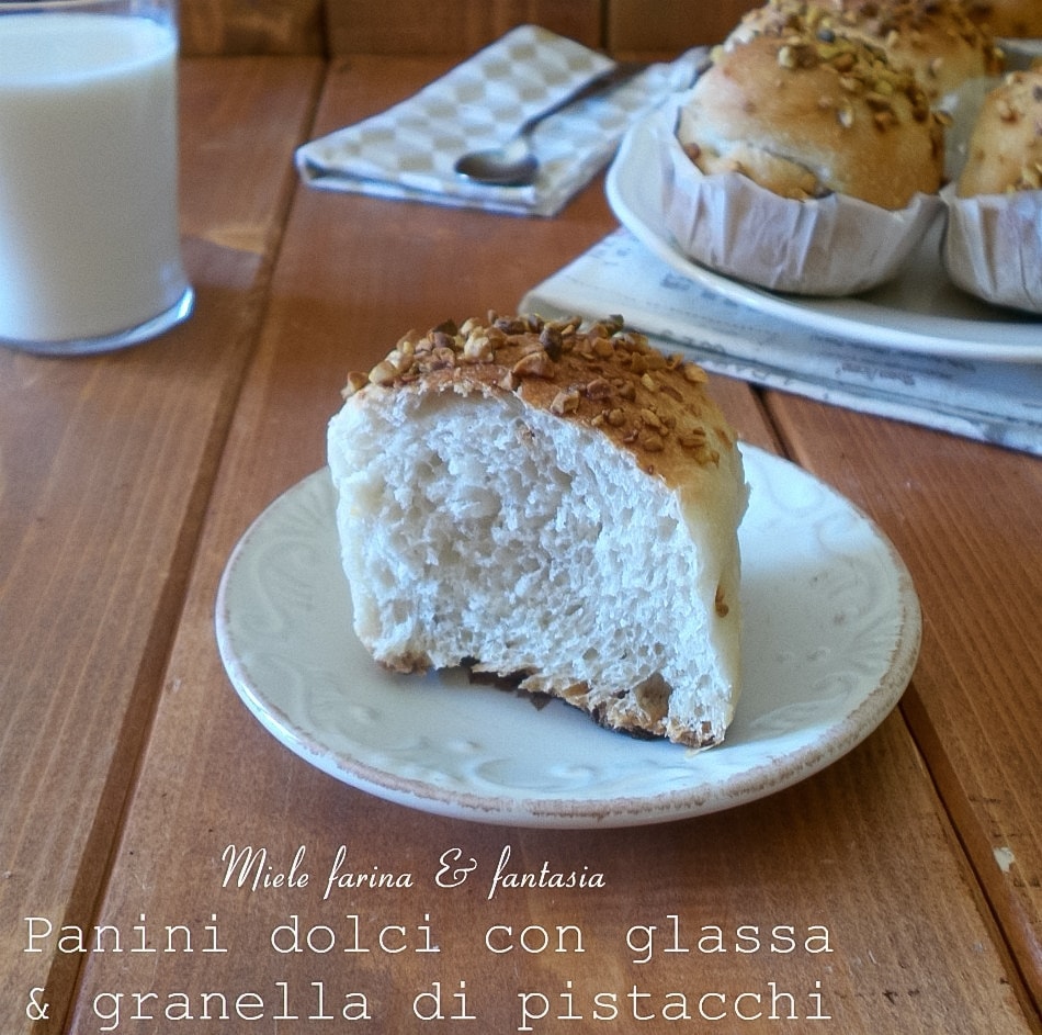 Heerlijk zacht en geurend, de zoete broodjes met glazuur en pistachenoten zullen elk moment van je dag verrukkelijk maken. Ze zijn gemaakt met natuurlijk gist en bevatten geen eidooiers. Stop ze in de lunchtrommel voor school of werk; het zal een genoegen zijn om hun zachtheid te proeven.