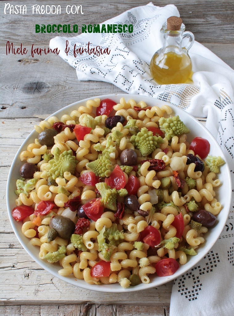 Vandaag stel ik jullie een volledig vegetarische koude pasta voor, verrijkt met romanesco broccoli en vele andere groenten. Het is een zeer kleurrijke en smakelijke korte pasta salade, bereid met ingrediënten die ik al in de koelkast had. Pasta salades zijn erg praktisch omdat ze ruim van tevoren kunnen worden bereid, perfect voor de lunch en het diner of als meeneemlunch om op het werk of in de vrije tijd van te genieten. Deze heerlijke bereiding kan ook worden gemaakt met volkoren pasta of rijst, of glutenvrije pasta.