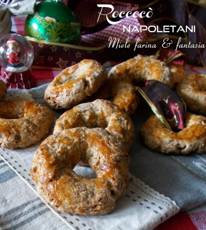 De roccocò zijn typische Napolitaanse zoetigheden die worden bereid tijdens de kerstperiode. De traditie wil dat dit gebak een ringvorm heeft, een harde textuur en een donkere amberkleur. Ze worden alleen gegeten, gedoopt in melk of geserveerd met zoete wijnen en likeuren. Ze blijven veel dagen goed, afgesloten in blikken dozen of voedselzakken en worden steeds lekkerder naarmate de tijd verstrijkt. Het basisrecept bevat geen eieren of boter of andere soorten vetten. In plaats daarvan is er het gebruik van grof gehakte noten in het deeg, de schil en het sap van sinaasappels en mandarijnen en, vooral, de aanwezigheid van een cruciaal ingrediënt dat niet mag ontbreken, namelijk de “pisto“, een mengsel van specerijen dat op een vakkundige manier is gedoseerd om een perfect evenwicht tussen de smaken te behouden en ervoor te zorgen dat geen enkele specerij de andere overheerst. Gewoonlijk wordt het kant-en-klaar in zakjes gekocht. De karakteristieke smaak van de roccocò komt precies van de “pisto”. Elke familie heeft zijn eigen persoonlijke recept voor de roccocò, dat verschilt van de andere door een grotere of kleinere hoeveelheid suiker (dat wil zeggen meer suiker voor harde roccocò, minder suiker voor een zachtere textuur die geen tandbrekers zijn), de aanwezigheid van alleen sinaasappels of alleen mandarijnen, Strega-likeur in plaats van anijs, enzovoort.. Het is een heel gemakkelijk te bereiden dessert. De enige voorzorg die moet worden genomen, is het doseren van de vloeistoffen, omdat het deeg hard en stevig moet zijn, zodat de klassieke ringen kunnen worden gevormd die hun vorm behouden tijdens het bakken. Ik had plezier met mijn zoon om ze te maken. Hij maakte kleinere roccocò, ik de grotere. Als je besluit om een halve portie te maken, is het voldoende om slechts een half zakje pisto toe te voegen.