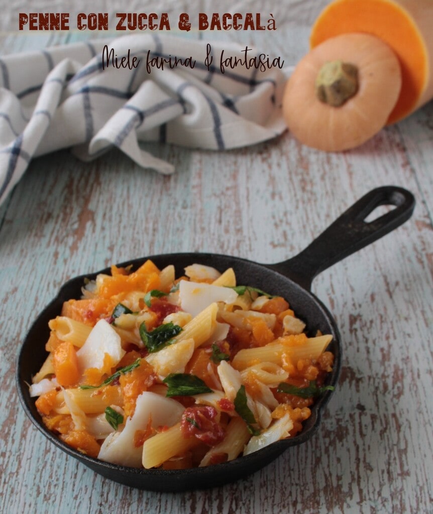 Vandaag hebben we het over pennette met pompoen en kabeljauw, een zeer smakelijk visschotel, lekker, eenvoudig, voedzaam en snel te bereiden. Een ietwat ongewone combinatie voor mij, maar die me aangenaam verraste door de smaak en vooral door de zachtheid van de smaken en geuren. De zoetheid van de pompoen gaat perfect samen met de zoutigheid van de kabeljauw en een snufje chilipeper draagt bij aan hun smaak. Ik hou niet bijzonder van gerechten met chilipeper, maar in dit geval is een snufje voldoende om het speciaal te maken. Voor de bereiding van de pennette met pompoen en kabeljauw kunnen we ook reeds gekookte kabeljauw gebruiken, eventueel overgebleven van een eerder recept, zoals ik deed.
