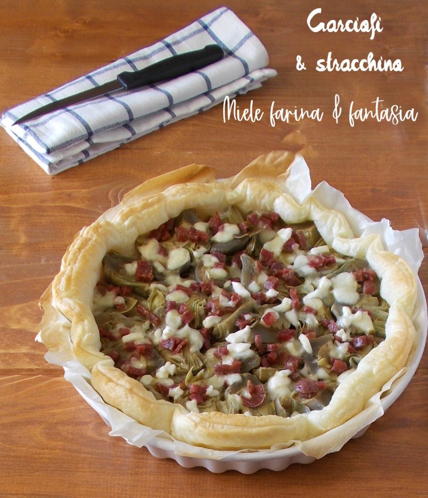 Vul het bladerdeeg met de artisjokken en verdeel er wat stracchino, de salami en de provola over.