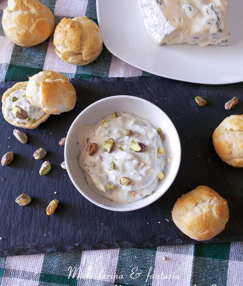 5) Terwijl de soesjes afkoelen, bereiden we de gorgonzolamousse. Doe de zachte gorgonzola in een grote kom of in een mixer met stalen gardes. Voeg beetje bij beetje melk toe en klop tot een stevige en opgeblazen crème is verkregen, zoals een mousse. Voeg ten slotte de geschaafde pistachenoten toe en meng ze door de mousse.