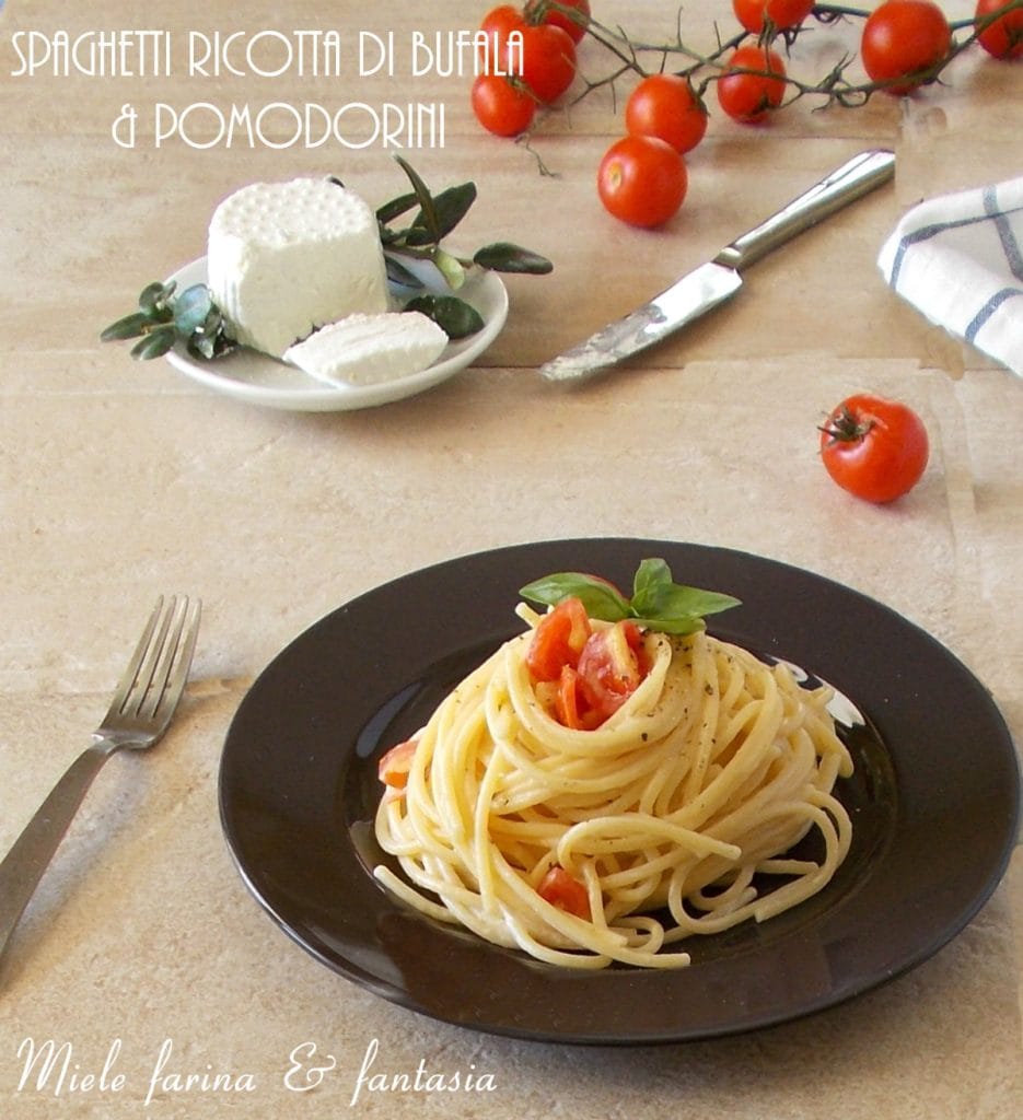 De spaghetti met buffelricotta en kerstomaten zijn heel eenvoudig, snel maar vooral heerlijk en zullen ook de kleintjes bevallen. De ricottasaus omhult de pasta volledig, waardoor dit recept een echte lekkernij wordt, mede dankzij de basilicum die een zeer aangename en frisse aromatische noot toevoegt. Wanneer we weinig tijd hebben om de lunch te bereiden of wanneer we een goed bord pasta op tafel willen zetten dat tegelijkertijd voedzaam en licht is, zijn de spaghetti met buffelricotta en kerstomaten precies wat we nodig hebben. De buffelricotta kan, als je dat wilt, worden vervangen door schapen- of koemelkricotta, afhankelijk van smaak en behoeften.