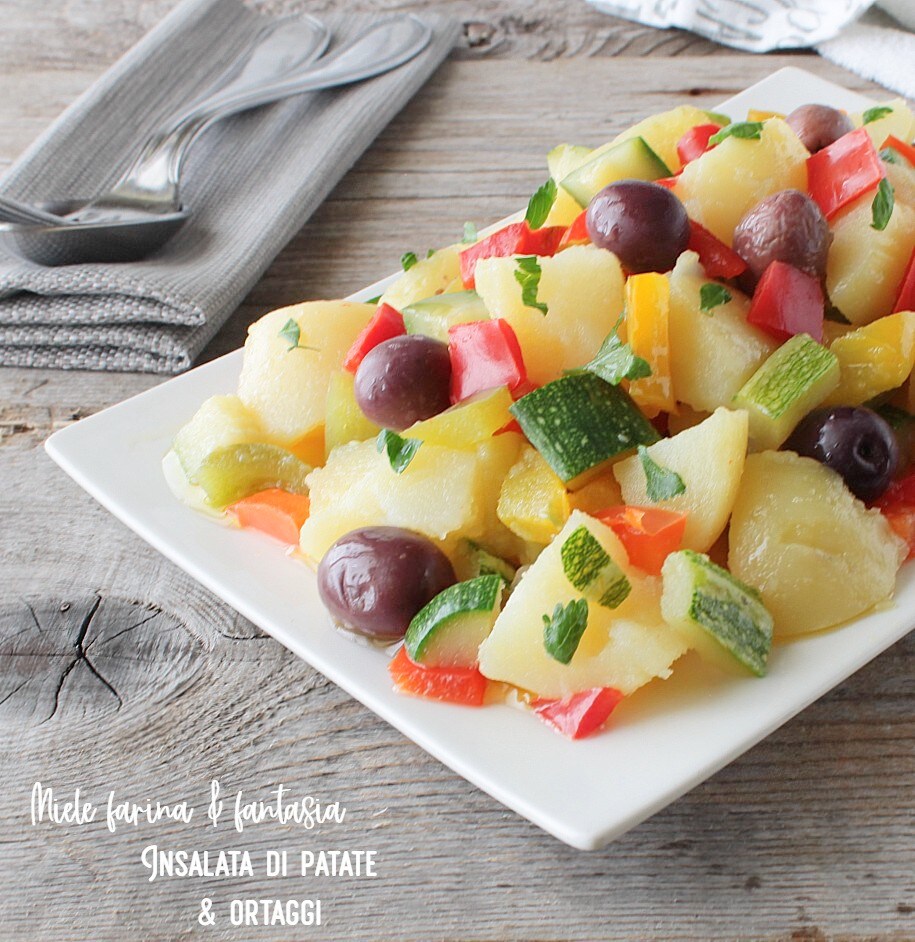 De aardappelsalade die ik jullie vandaag wil presenteren is een smakelijke koude schotel op basis van aardappelen en seizoensgroenten, heel eenvoudig, heel smakelijk, glutenvrij, lactosevrij of zonder melkderivaten. Het wordt ruim van tevoren bereid zodat de ingrediënten die gekookt moeten worden goed koud zijn voordat ze aan de salade worden toegevoegd en worden gekruid. Aardappelsalades, net als rijst- en pastasalades, zijn typische zomermaaltijden, omdat, wanneer de hitte drukkend wordt, men alleen maar verlangt naar frisse, lichte en smakelijke gerechten; bovendien kunnen ze eindeloos worden verrijkt en gepersonaliseerd met zowel fantasie als wat we al in huis hebben. Om deze heerlijke aardappelsalade een complete maaltijd te maken, kunnen we peulvruchten, hardgekookte eieren, tonijn of andere ingrediënten naar keuze toevoegen. Laten we niet vergeten dat salades, of het nu aardappel-, pasta- of rijstsalades zijn, in kleine en handige lunchboxen kunnen worden vervoerd om tijdens het werk, een picknick of aan zee van te genieten.
