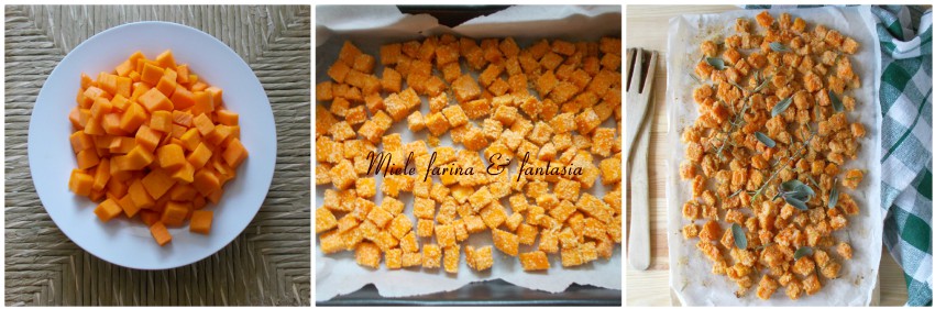Verdeel de pompoen over de bakplaat, zonder de blokjes te overlappen en zet in de oven, op middelhoge stand, ongeveer 10-12 minuten als je boven- en onderwarmte gebruikt in een heteluchtoven; anders ongeveer 20 minuten bij alleen onderwarmte.