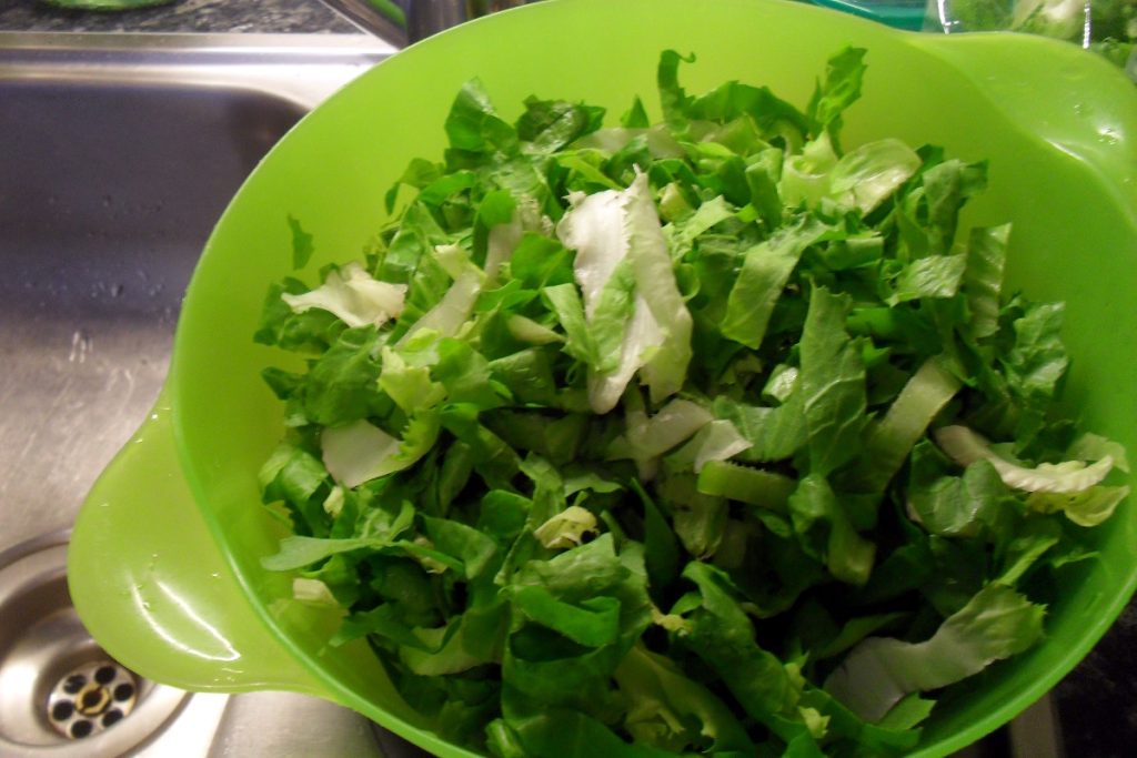 Snijd ondertussen de andijvie in reepjes en spoel deze 3-4 keer in een gootsteen vol water om eventuele grondsporen te verwijderen. Goed laten uitlekken en apart houden.