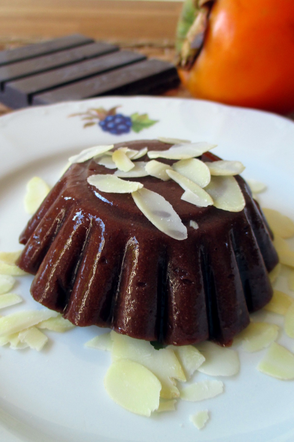 En hier is onze kaki en cacao pudding klaar om te worden geserveerd en genoten. Ik heb het versierd met amandelschilfers die uiteraard apart moeten worden geteld.