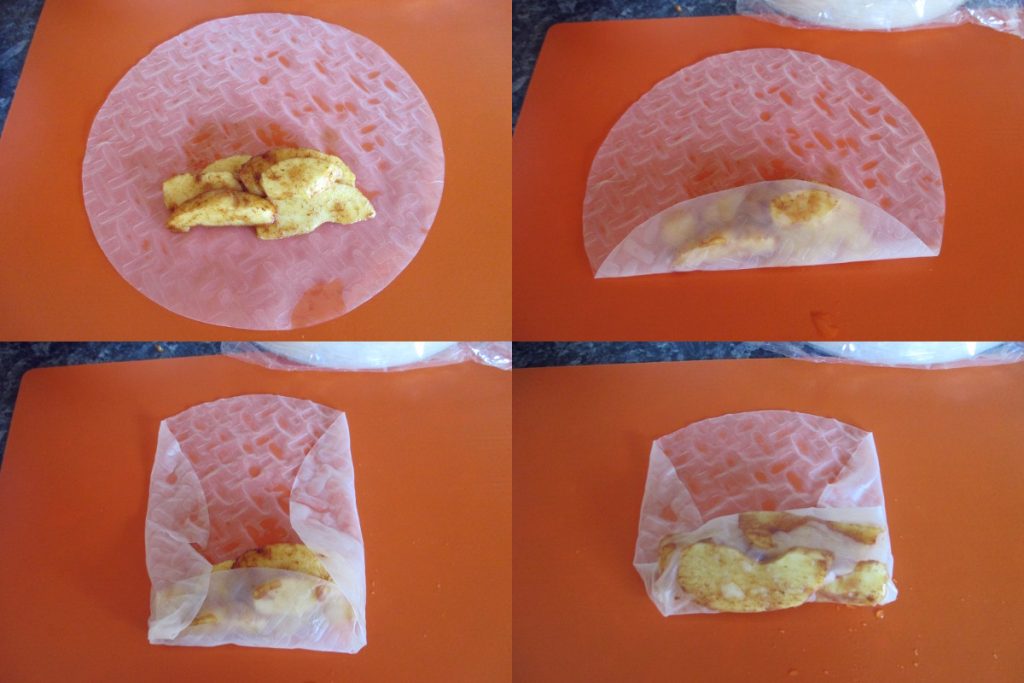 Leg enkele plakjes appel op het rijstpapier, aan de onderkant, met ruimte aan de zijkanten zoals je op de foto ziet. Vouw eerst de onderkant naar boven, dan de zijkanten naar het midden en rol vervolgens voorzichtig op. Als het rijstpapier een beetje breekt, is dat geen probleem, leg gewoon de twee gebroken uiteinden over elkaar en rol op: het water zorgt ervoor dat ze aan elkaar blijven.