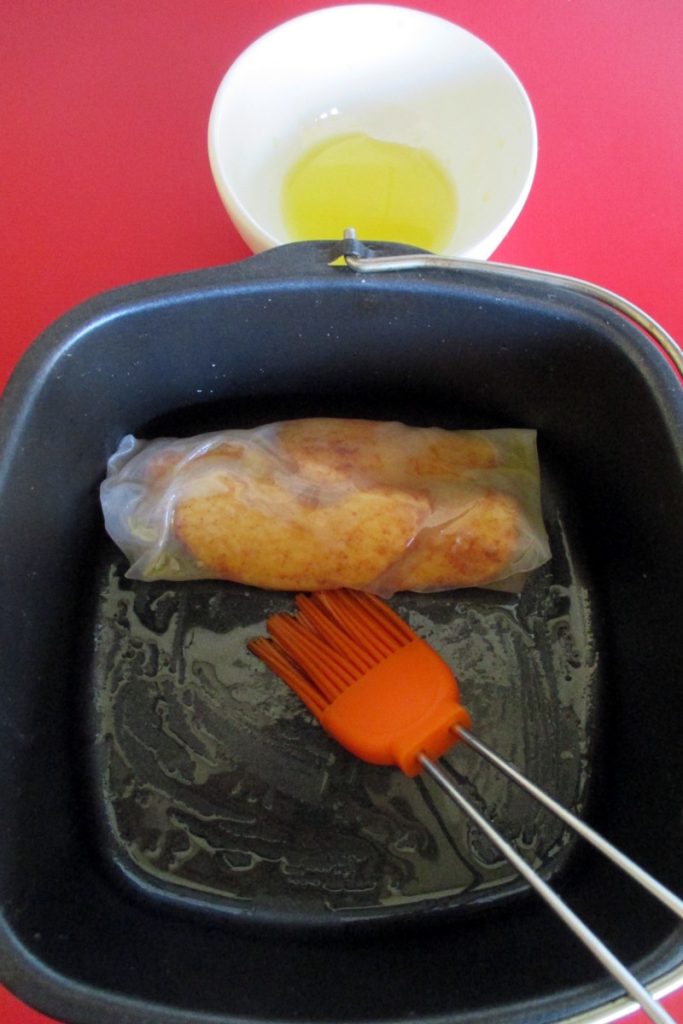 In dit geval raad ik aan om de bijgeleverde bakplaat van de airfryer te gebruiken als je er een hebt zoals de mijne op de foto, of een andere bakplaat, zelfs van siliconen, die in de mand past. Vet de bakplaat die je gebruikt licht in, leg de rolletjes erin en bestrijk ze voorzichtig met olie. Bak ze op 180°-200° gedurende ongeveer 20° en draai ze af en toe.