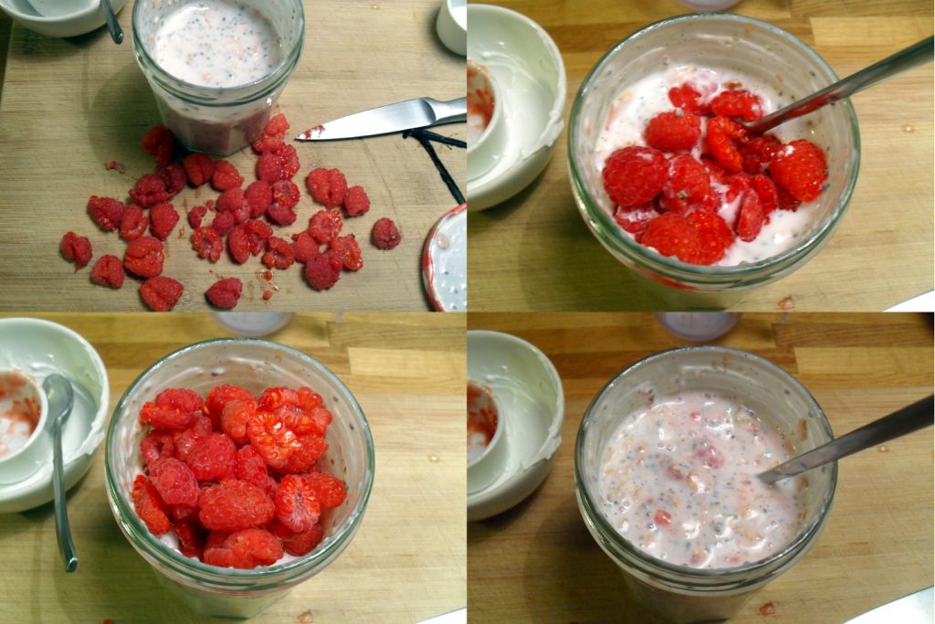 Voeg de gesneden frambozen aan het potje toe en roer voorzichtig met een lepeltje zodat ze opgaan in het mengsel.