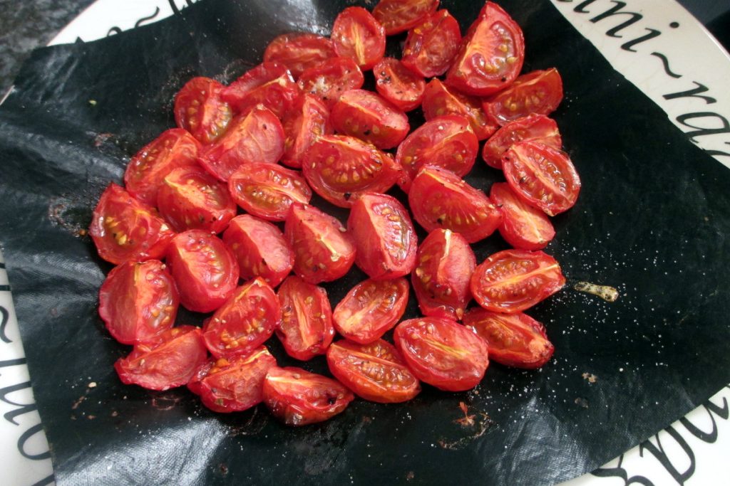 Als je confit-tomaatjes maakt, kun je ze beter van tevoren klaarmaken en warm houden in de airfryer of oven. Ik snijd ze doormidden of in kwarten en leg ze op een siliconenmat: in mijn geval heb ik er een op maat gesneden voor de mand van mijn airfryer. Dan bestrooi ik de tomaatjes met zout, knoflookpoeder en oregano. In de airfryer op 180° voor 13 minuten. In de oven beter op 200° en dat duurt ongeveer 25 minuten: controleer dat ze niet verbranden!