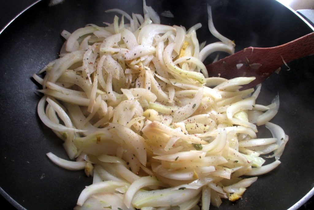 Snijd ui en venkel in dunne plakjes en fruit ze in de pan met 2 theelepels olie, wat zout en wat gedroogde tijm.