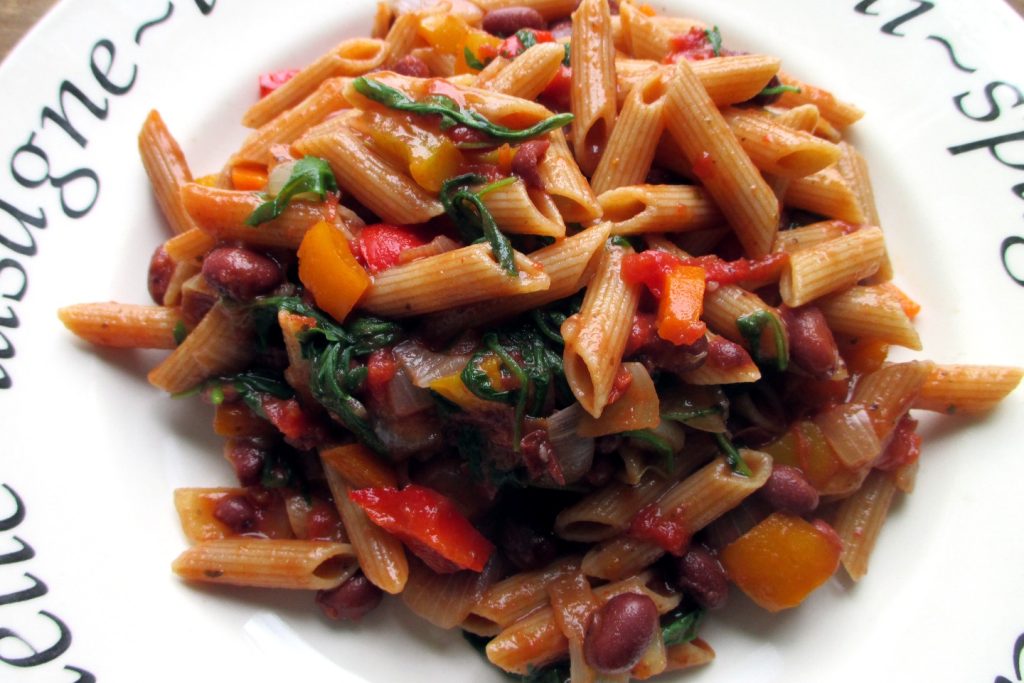 Hoe lekker is de pasta op Mexicaanse wijze! Er is geen bijzondere reden om het zo te noemen, behalve het feit dat het recept voor de saus erg lijkt op dat van de Chili con carne. In feite zijn bijna alle ingrediënten aanwezig: Mexicaanse bonen, paprika’s, specerijen. Het gehakt ontbreekt vooral omdat dit recept veganistisch is en ook omdat het toevoegen van sojagehakt echt een beetje te veel eiwitten zou zijn naar mijn mening…