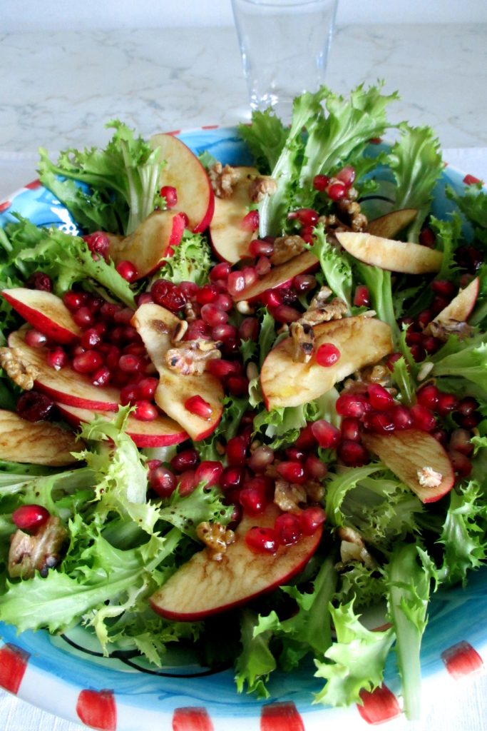 Leg alle krulandijvie in een grote slakom in een waaier. Verdeel de appelplakjes, de granaatappelpitjes met hun sap, de gedroogde cranberry’s, de walnoten en de pijnboompitten over de krulandijvie en eindig door het olie- en balsamicomengsel er gelijkmatig overheen te druppelen.