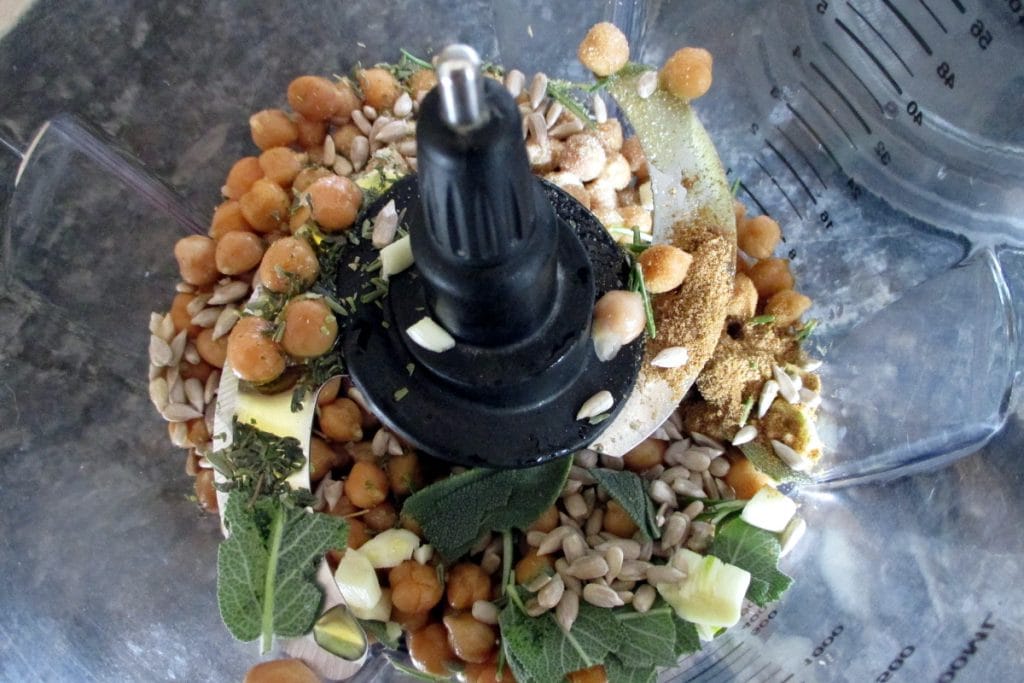 Doe de kikkererwten, zonnebloempitten, kruiden, gedroogde specerijen en een beetje zout in de blenderkan.