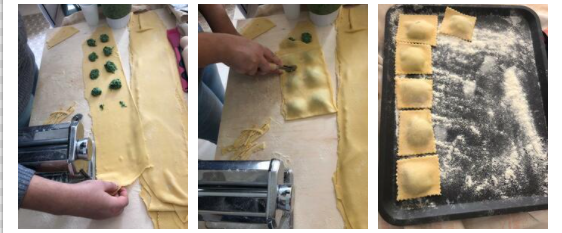 • Om de ravioli te bereiden, begin je met het deeg: volg de stappen van de eierpasta. Kleine opmerking: omdat in dit recept een grotere hoeveelheid griesmeel wordt gebruikt, kan het nodig zijn om een eetlepel water aan het deeg toe te voegen om de juiste consistentie te verkrijgen, en een tweede eetlepel indien nodig.